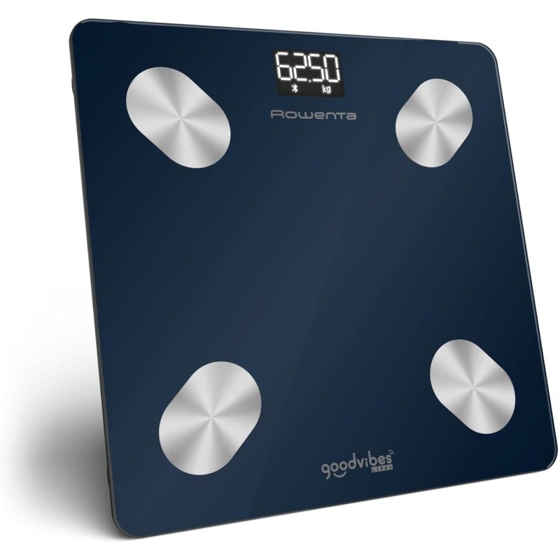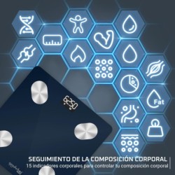 Pèse-personne connecté. 180 kg/50 g. Plateau verre 30x30 cm. Ecran d’affichage LED rétro-éclairé. 3 piles AAA fournies. 15 indicateurs de santé : Poids, IMC, graisse corporelle, masse musculaire, masse osseuse, masse graisseuse, eau corporelle, graisse sous-cutanée, graisse viscérale, âge métabolique... maigre, masse hydrique. Application mobile via Bluetooth : Tableau de bord et graphiques.