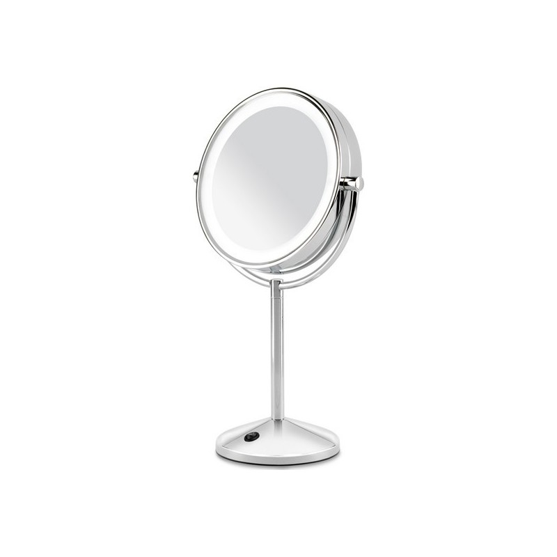 Miroir au fini chromé élégant et doté d'un éclairage ambiant doux.