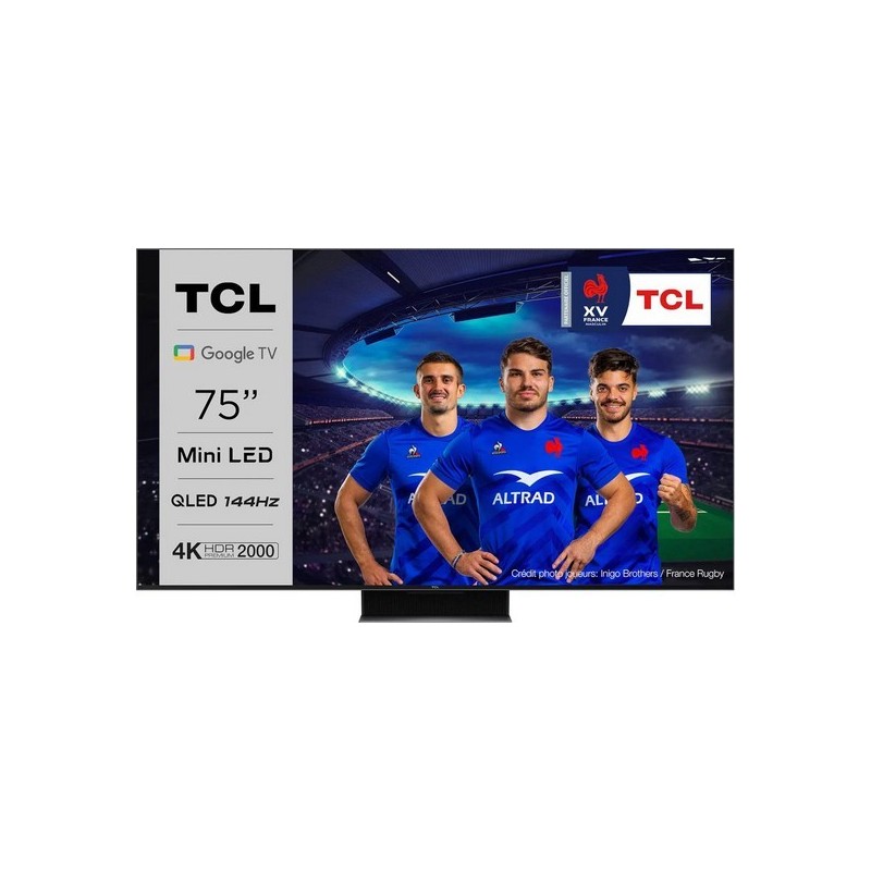 Ecran Mini LED avec QLED, 75 pouces. Résolution: 3840 x 2160 pixels. Système sonore Onkyo avec Dolby Atmos : 2 x 20W. Processeur QuadCore, Google TV, Netflix, Youtube. 4 prises HDMI 2.1 - Wifi intégré. Dimensions avec pied : 1671 x 993 x 320 mm.