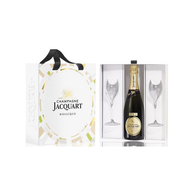 Un coffret contenant 1 bouteille Brut Mosaïque SIGNATURE 5 ans d'âge avec 2 flûtes.
